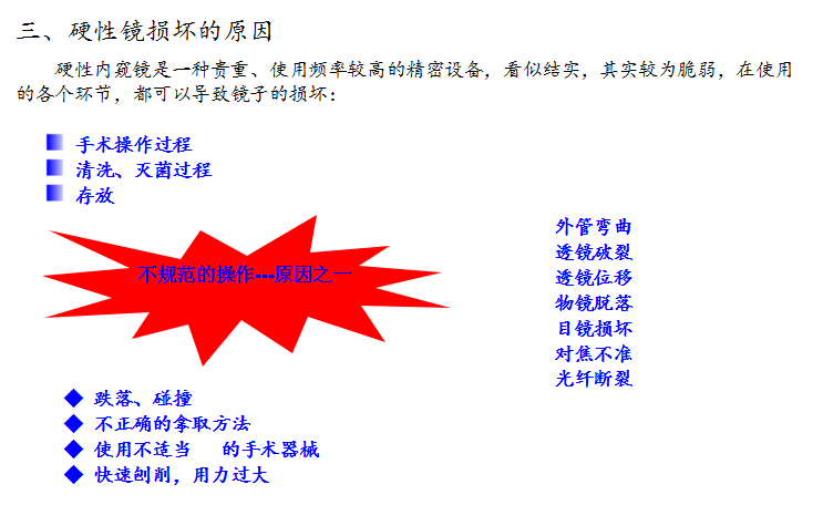 有些手術(shù)窺鏡是在鞘管內(nèi)使用,在更換其他角度窺鏡或插拔器械時,應(yīng)注意動作要輕,不可用力過猛。尤其是插拔窺鏡過程中,當(dāng)遇到阻力拔不動時應(yīng)仔細(xì)查找原因,必要時應(yīng)連同鞘管一起拔取,不要用蠻力。當(dāng)窺鏡配合激光汽化、高頻電切、微波等光電技術(shù)進行手術(shù)時,應(yīng)注意窺鏡前端與治療點的距離,保證窺鏡前端不被電擊或燒灼。 目前在耳鼻喉科、骨科的臨床手術(shù)中已經(jīng)廣泛使用刨削器來切除病變組織。其刀頭鋒利、硬度高、旋轉(zhuǎn)速度快、力矩大,如果削到內(nèi)窺鏡,窺鏡必?fù)p無疑。